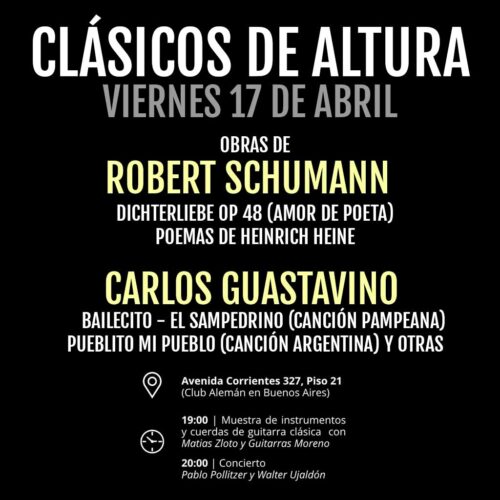 El Club Alemán en Buenos Aires tiene el agrado de invitarlos a un nuevo concierto del ciclo “Clásicos de altura”, a realizarse el próximo viernes 17 de abril a las 19:00 horas, en nuestras instalaciones.